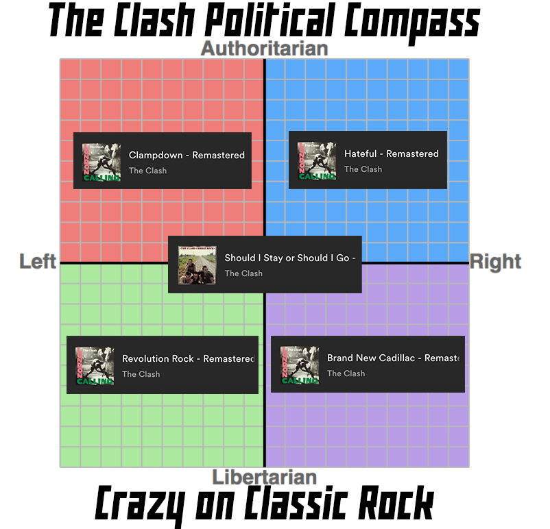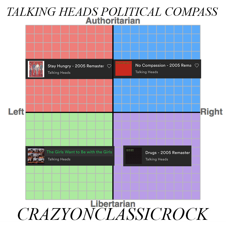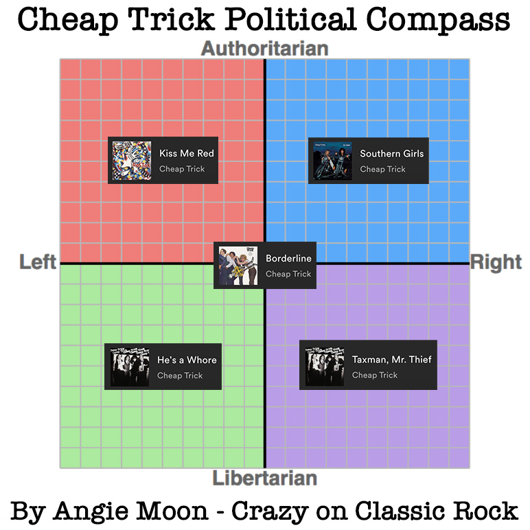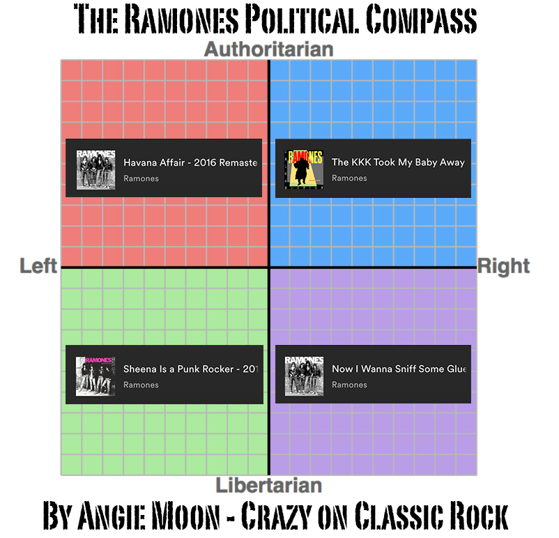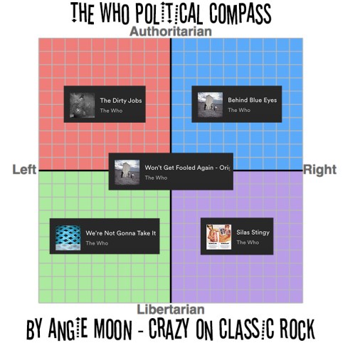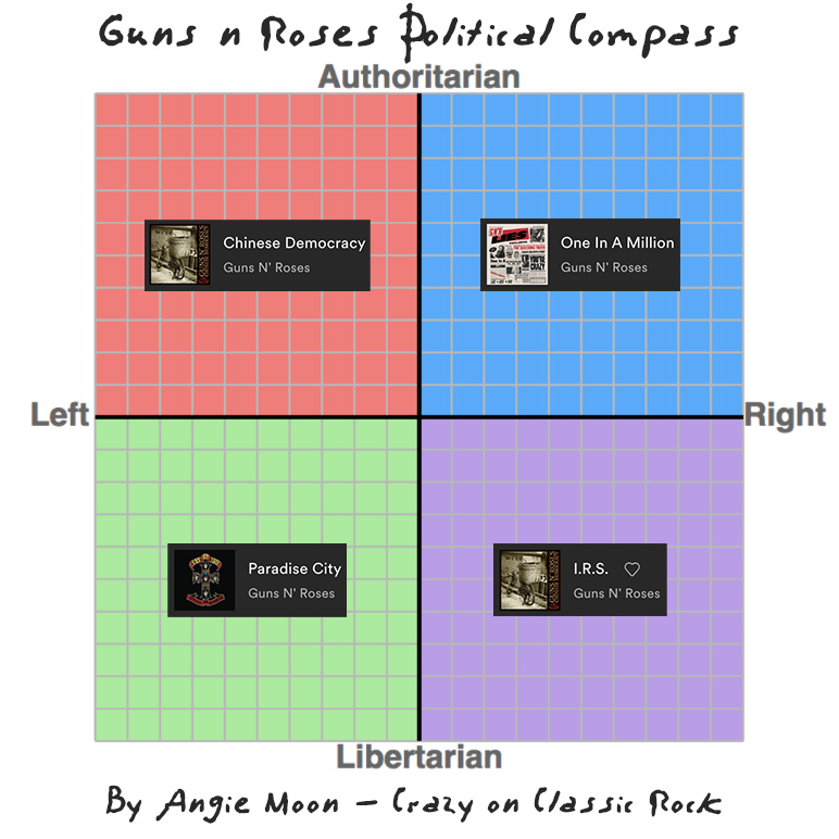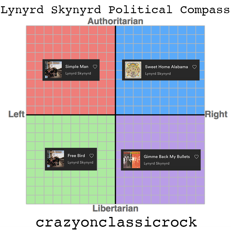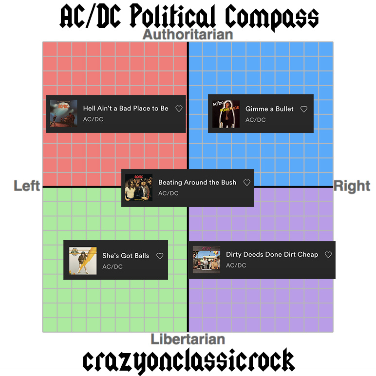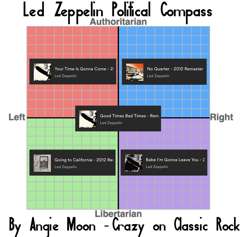 As a “filler” – but not a boring filler, I had this blog post idea in my back pocket. As you know, I love memes and have made a bunch in my time in the classic rock fandom. I’m also into politics and why not combine the two to make political compass classic rock memes? First, I’ll go over a little background on what a political compass is so you can understand where I’m coming from. Before I go onto that, I’ll say this: these are memes, please don’t take them seriously. I based these off of song titles, not necessarily the content of songs (believe me, I’d have a hard time filling in the authoritarian right quadrant if I stayed true to the meaning of the lyrics).