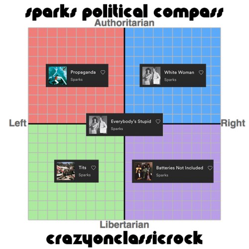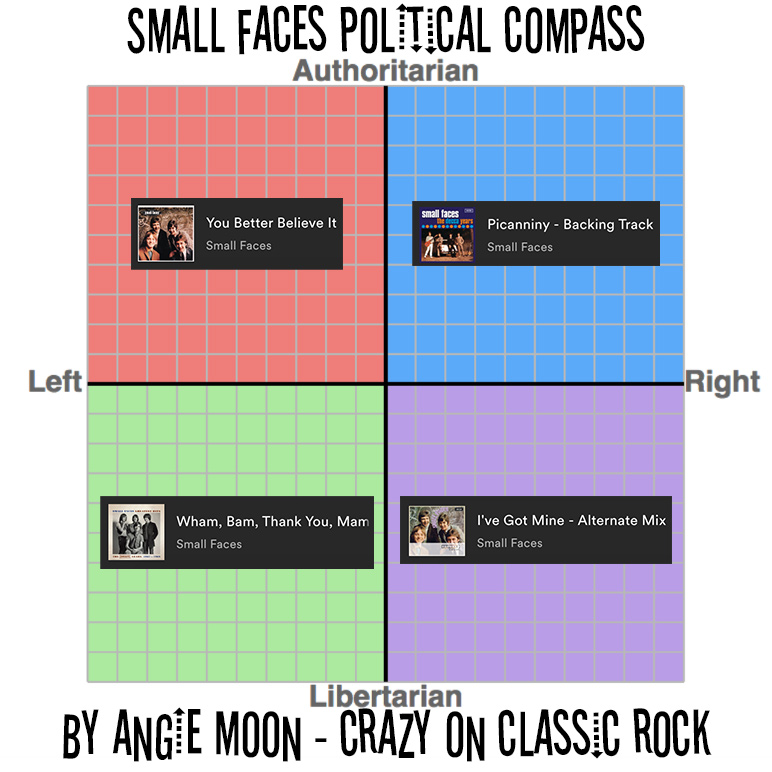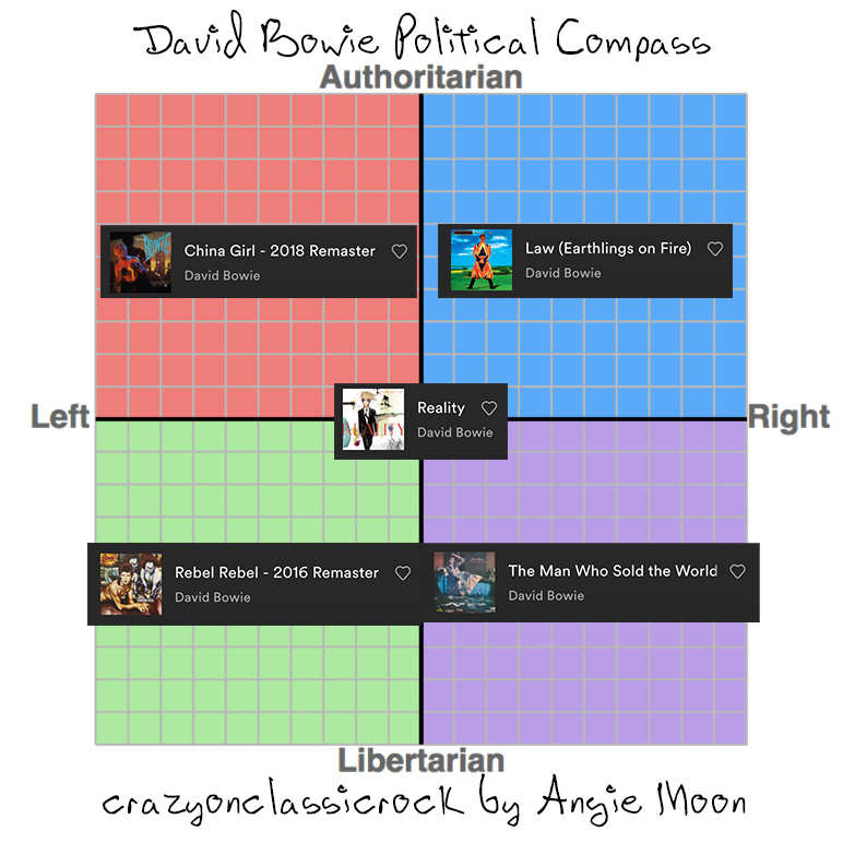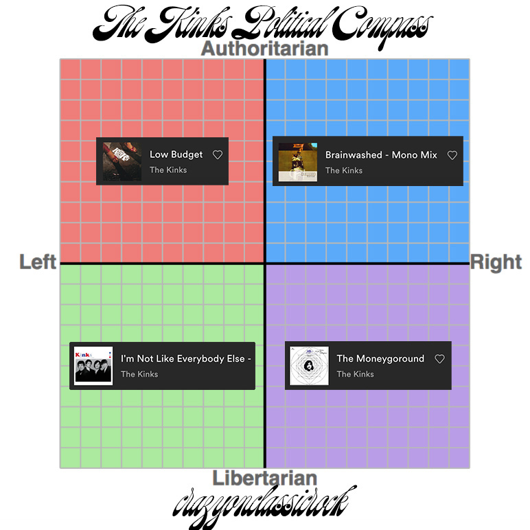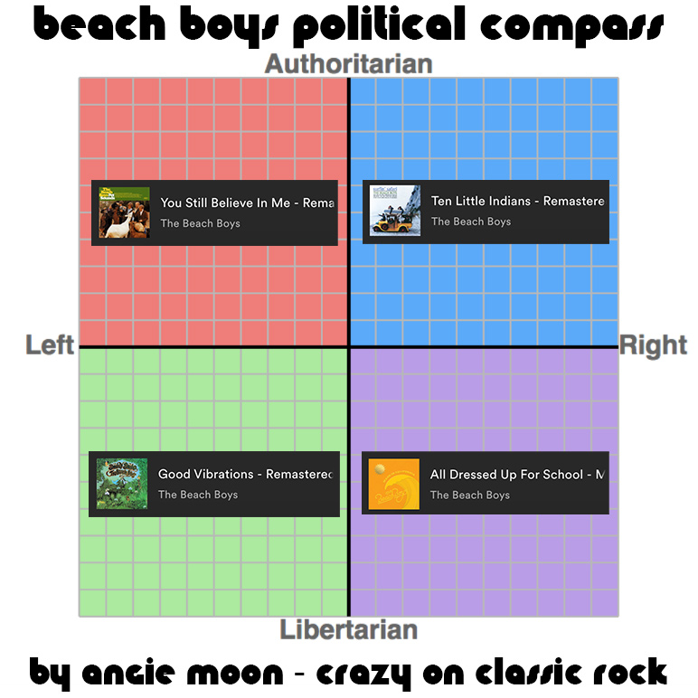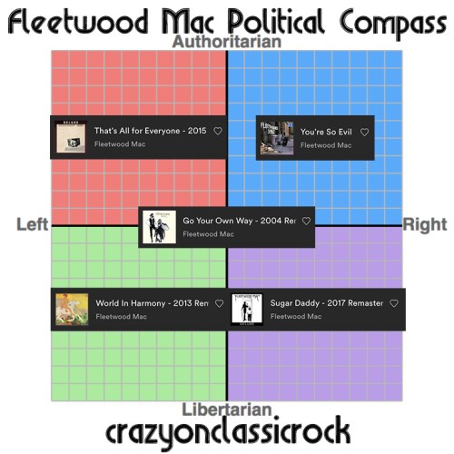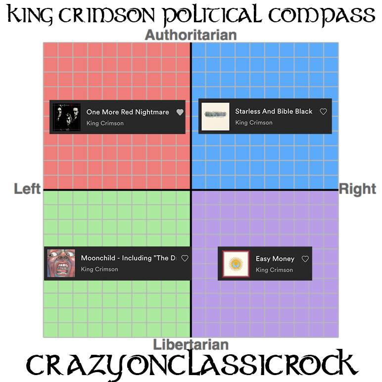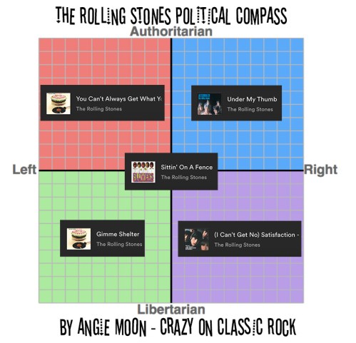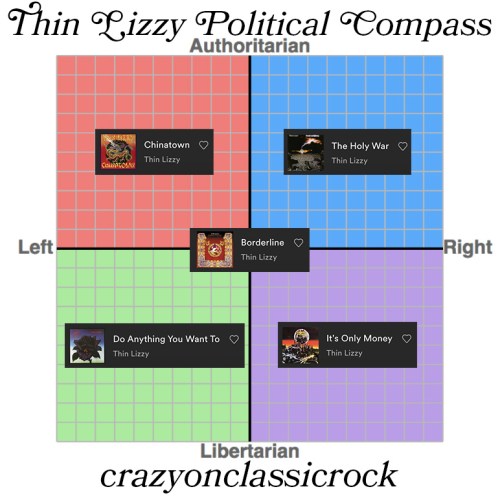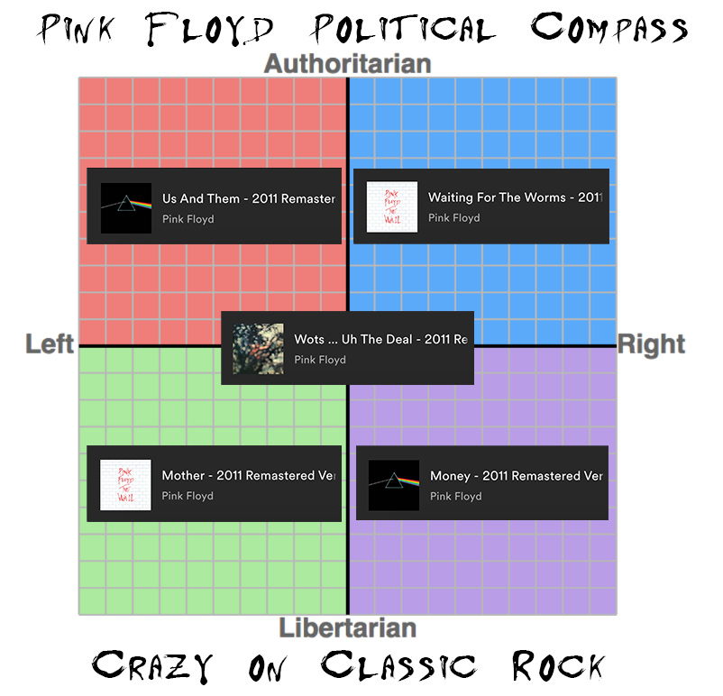 As a “filler” – but not a boring filler, I had this blog post idea in my back pocket. As you know, I love memes and have made a bunch in my time in the classic rock fandom. I’m also into politics and why not combine the two to make political compass classic rock memes? First, I’ll go over a little background on what a political compass is so you can understand where I’m coming from. Before I go onto that, I’ll say this: these are memes, please don’t take them seriously. I based these off of song titles, not necessarily the content of songs (believe me, I’d have a hard time filling in the authoritarian right quadrant if I stayed true to the meaning of the lyrics).