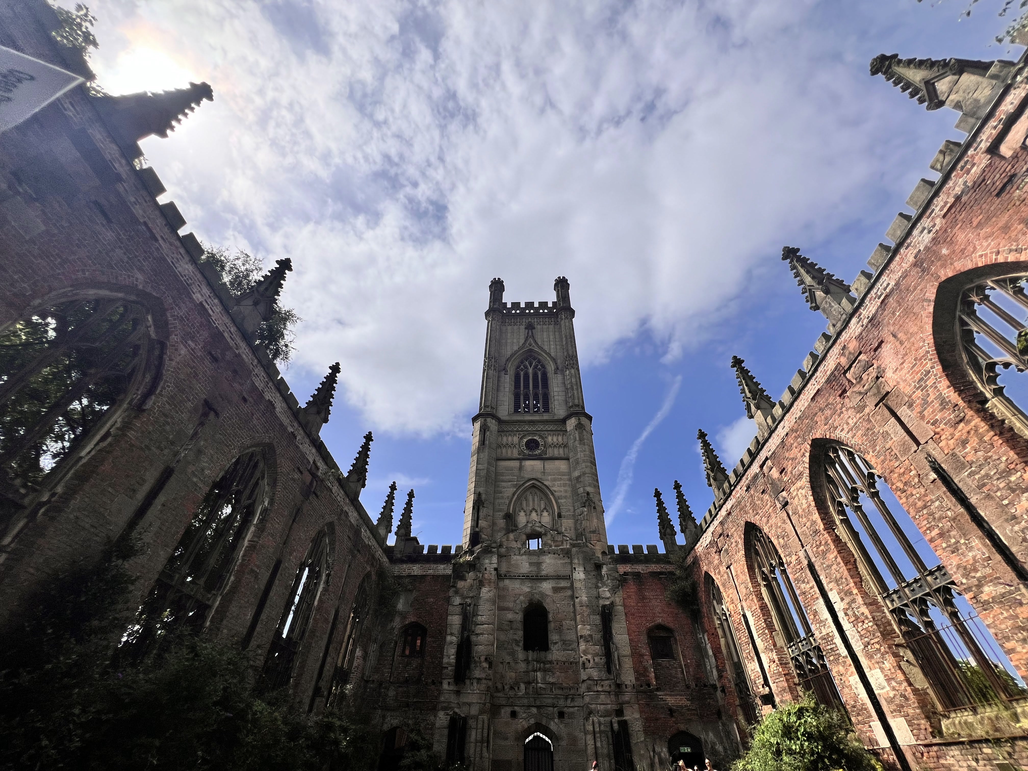 After shopping and coffee, we were looking forward to some food and Liverpool has a lot of vegan options. Bold Street has many vegan friendly places with the marquees and signs proudly displaying vegan-friendly, but I wanted to try an exclusively vegan restaurant closer to the docks and the name of the place caught my eye: Woo Tan Scran, located inside an aptly named bar/restaurant called Down the Hatch, since it’s in a basement (for any handicapped folks reading this, it’s unfortunately not wheelchair accessible at the moment). On the way there, we visited the bombed out church and took some photos. A sad reminder of the effects of war.