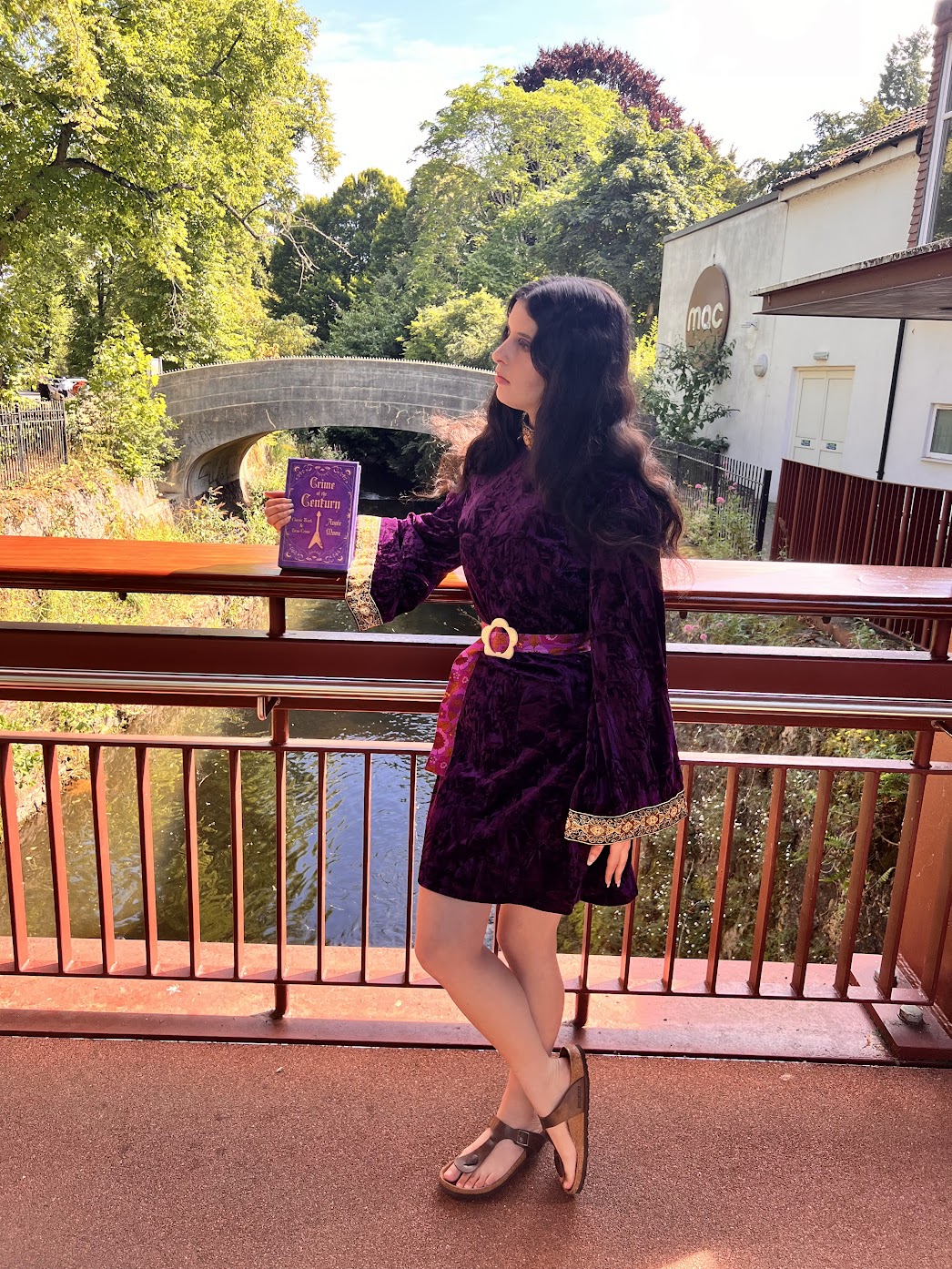 My friend Chloë made the crochet bunting and crochet moon keychains and the moon pillow behind the mushroom Squishmallow with the Dave Davies sunglasses. The crochet got a lot of compliments and I think that the stall looks really cohesive with the purple floral print tablecloth, purple plushies, purple crochet, my book, and my outfit! My outfit got a lot of compliments by the way! So before the book fair started, I wanted to take a couple of pictures with my book: