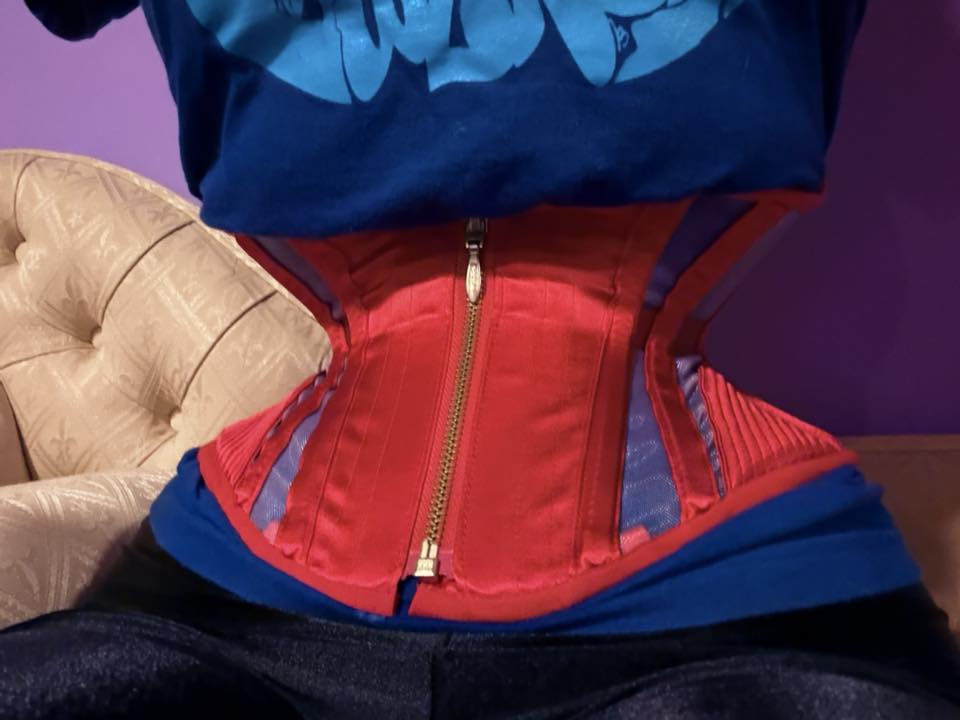 I’ve been wearing corsets for about 5.5 years now. I would wear them to relieve chronic pain from period cramps. You can read more about my chronic illness and hysterectomy journey in this blog post. I went from a 26″ natural waist to a 23″ natural waist, and I’ve sized down from 22″ corsets to 20″ and 18″ corsets. I started off wearing off the rack (OTR) pieces from Restyle and Timeless Trends (both are good budget brands) before switching to custom fit pieces, as OTR couldn’t meet my needs anymore.